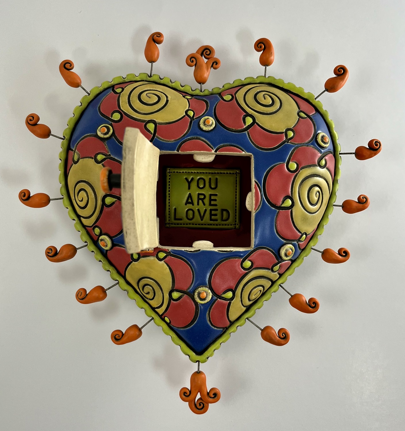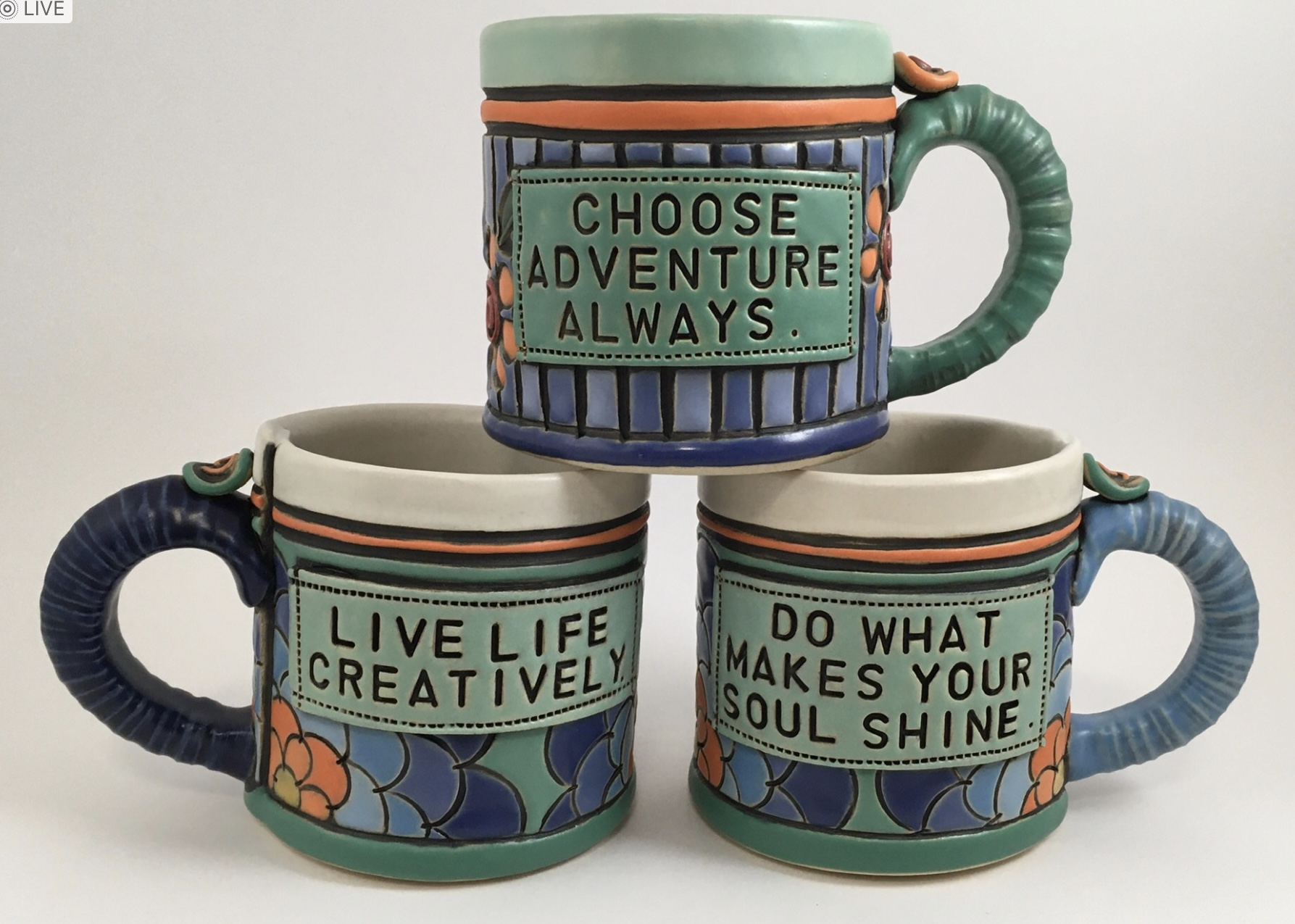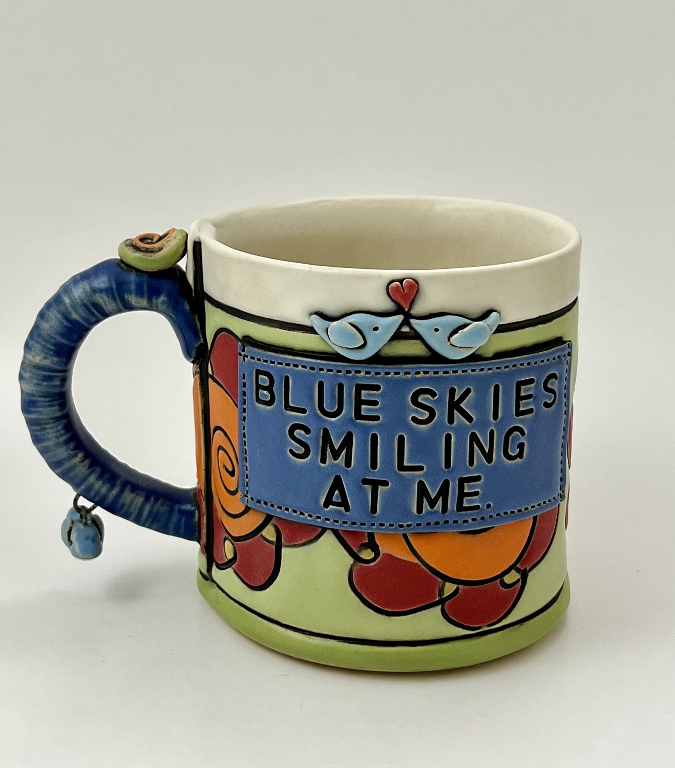 I don’t know. I have this need to keep adding. First I started adding little buttons. I wanted the texture. And then I was adding little dangly things off the handle and then I started playing with the on/ off switch. That’s a recent thing. I still haven’t got it quite down and I have a worry bead on one of my mugs. I am exploring this high temperature wire and what I can do it with it.