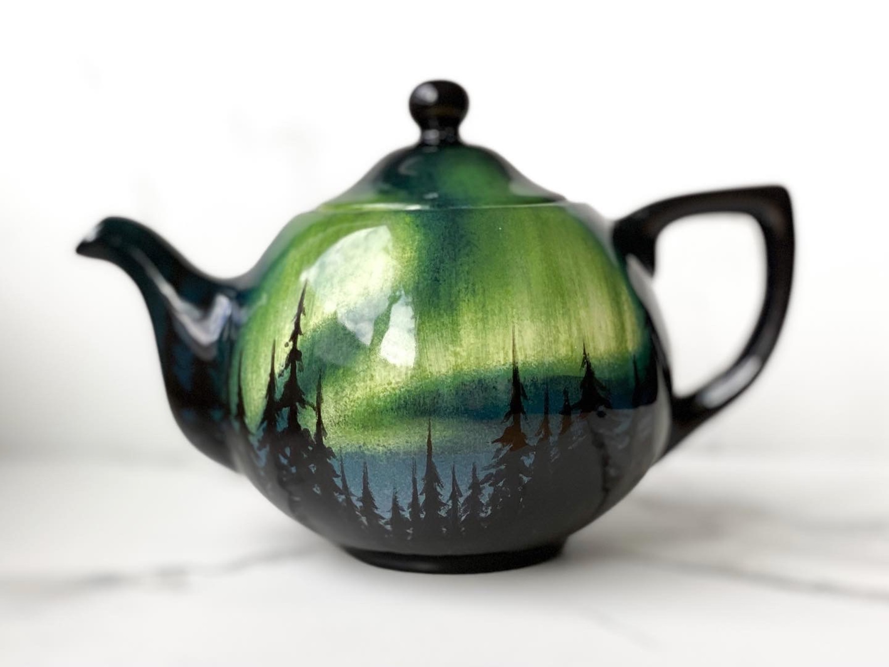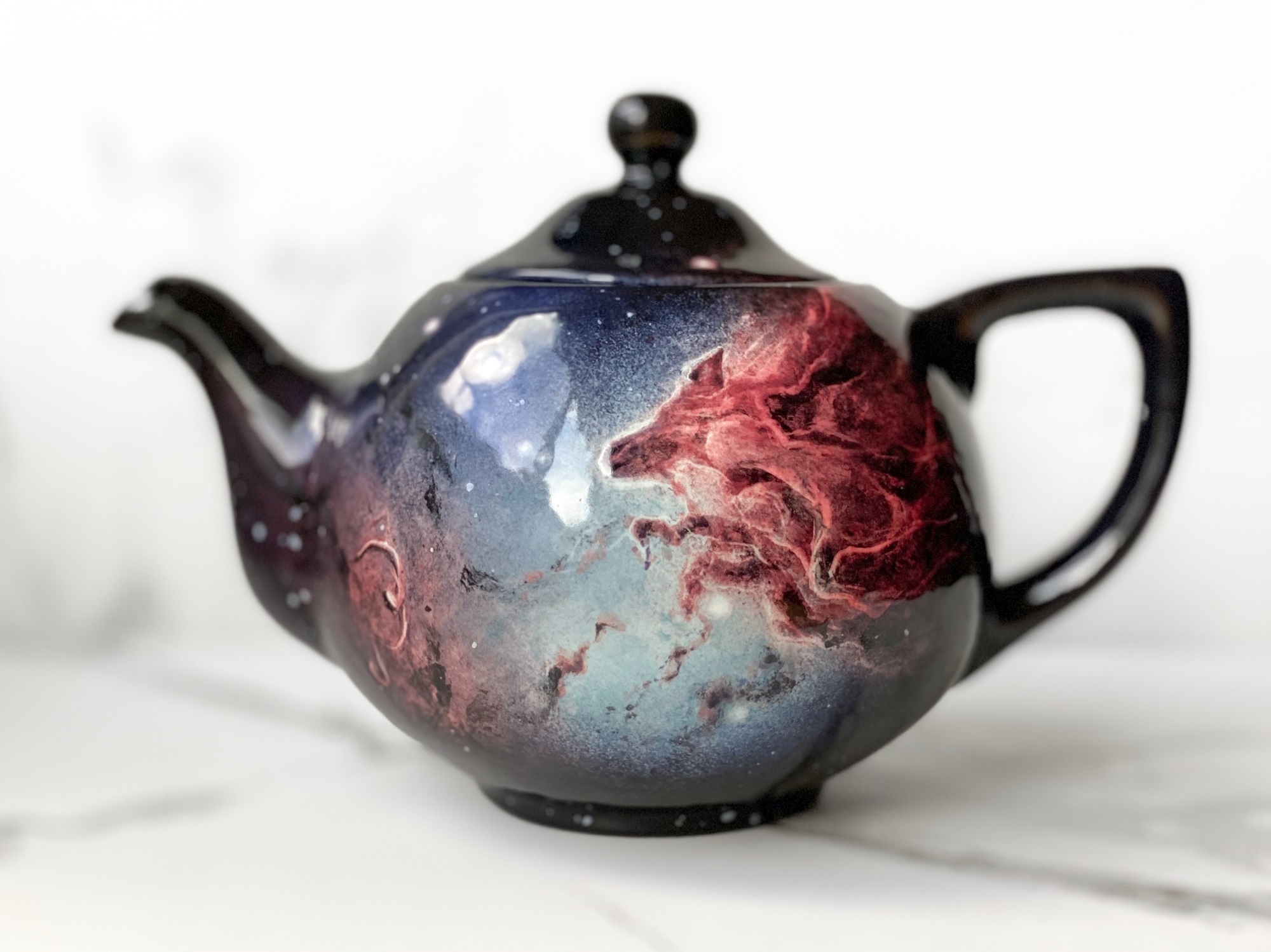 Yes, I feel like it has gotten easier to compose over time, but you do have to consider the shape of the piece. A tea pot is round and it and you will need to consider a distorted landscape if you are putting that on that surface. Or a cup might have a certain angle to it and that affects the way a spaceship might look on that sort of a surface. So it’s just getting to know your bisqueware shape.